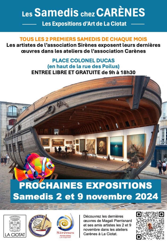 Après l’Eden… les Ateliers Carènes La Ciotat ! Nous serons 4 artistes Sirènes à exposer ce samedi 2 novembre de 9h00 à 18h30 dans un lieu atypique chargé d’émotions et d’histoires, venez le et nous découvrir, nous serons ravies de vous accueillir, de vous parler de notre passion et vous présenter nos dernières œuvres… et là pluie ou pas, nous serons à l’abri !
