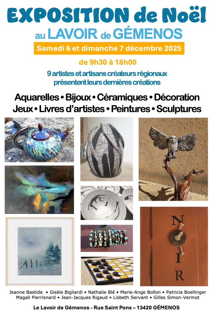 le week-end du 7 et 8 décembre 2025, j’ai le plaisir d’exposer au Lavoir de Gémenos, en compagnie d’artisans d’art !